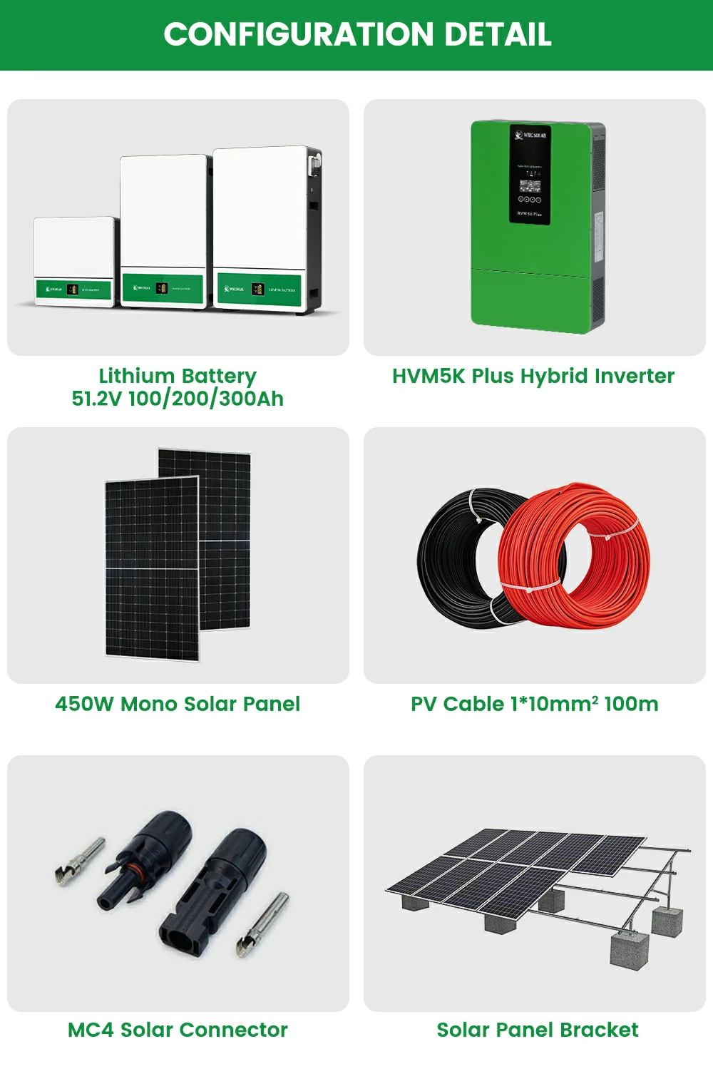 In addition to the above hardware accessories, this 6kw off-grid solar kit has additional photovoltaic cables, battery cables RV1*35mm² 50cm, and MC4 solar panel series connectors. It is specially used to connect photovoltaic solar panels and solar cell systems without additional purchase. It can help you save money and time in purchasing accessories, and allows you to install the entire solar system faster.