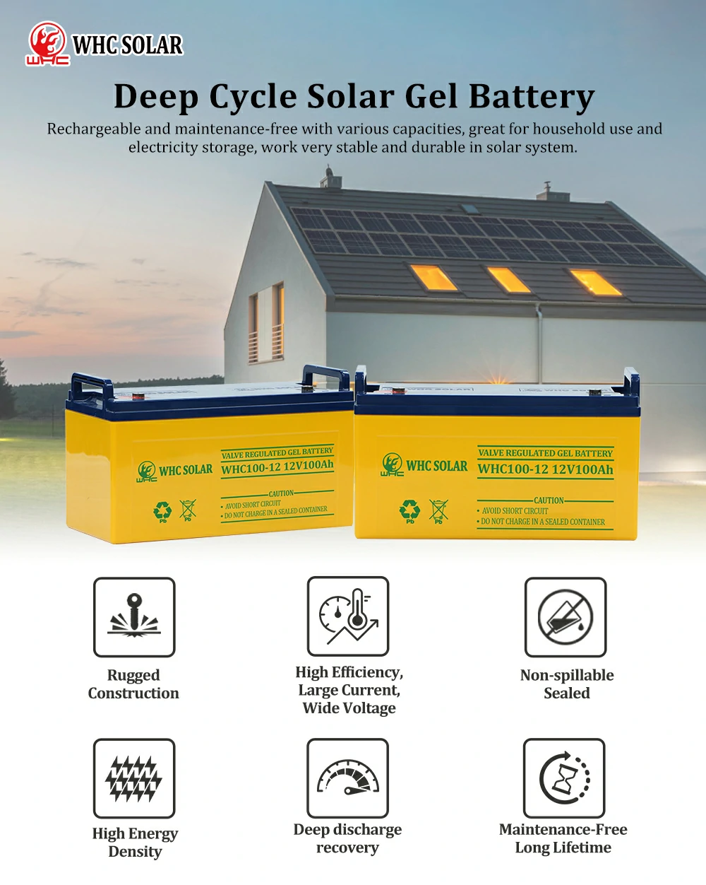 Solar gel battery is a kind of sealed valve-regulated control (VRLA)battery gel electrolyte battery technology. It is designed for the solar energy system. There is no liquid inside the gel battery, and the electrolyte is in the form of a gel, which maintains a solid state between the positive and negative plates inside the battery. The most common gel battery voltage is 12V, and there are different capacities such as 100Ah, 150Ah, 200Ah, etc. It is very popular in solar energy systems.