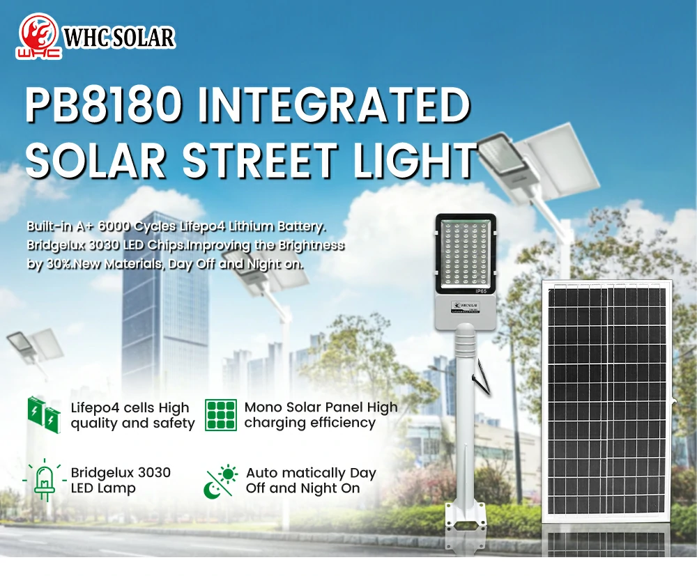 WHC PB8180 series 80W Outdoor Solar Street Light, with Lithium Battery and Remote Control, IP65 Waterproof, Auto Switch. Applications: Home, Garden, City, Highway, Etc.