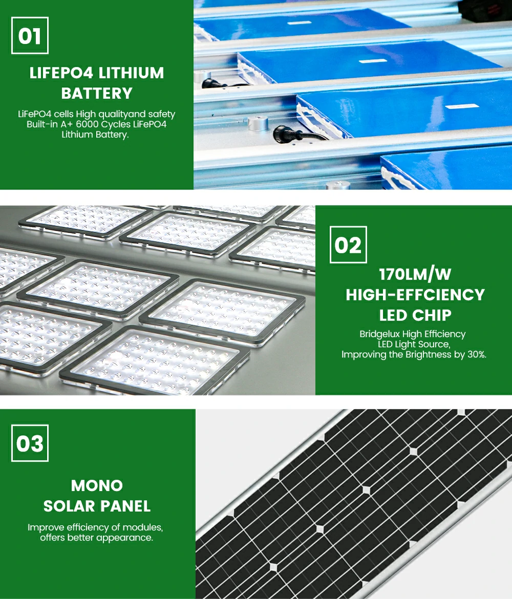 Led Have High Power and Long Life. Because It Uses the American Bridgelux 3030 Lamp Chip. In Addition, the Led Module of the Street Light Has an Adjustable Angle, Which Is Suitable for Roads With Different Terrains. The Viewing Angle Can Be Adjusted According to Different Terrains,and Its Range of Solar Led Lights Is as High as 140°. The Entire Led Lamp Module Is Made of High-Grade Aluminum Alloy Material, Which Has Good Anti-corrosion Performance.