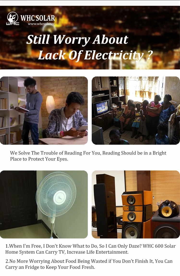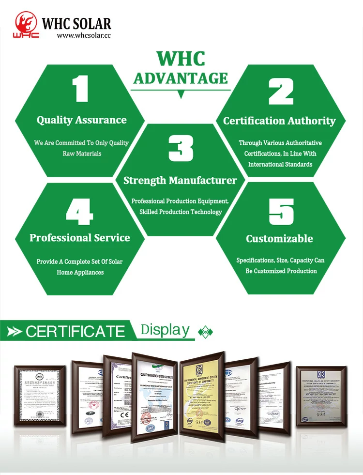 We at WHC Solar are one of the best solar manufacturers in China. We focus on selling high-quality solar system products. So don't worry about quality issues. Our best solar power generation system is also designed with a variety of protection measures, including fault symbol indication, short circuit and reverse connection protection (solar panel), battery reverse connection protection, battery overvoltage protection, battery low voltage protection, overload protection, short circuit Circuit protection, lightning protection. Safe! If you encounter any problems during the purchase process, please feel free to contact us, we will answer any questions for you with the best quality service.