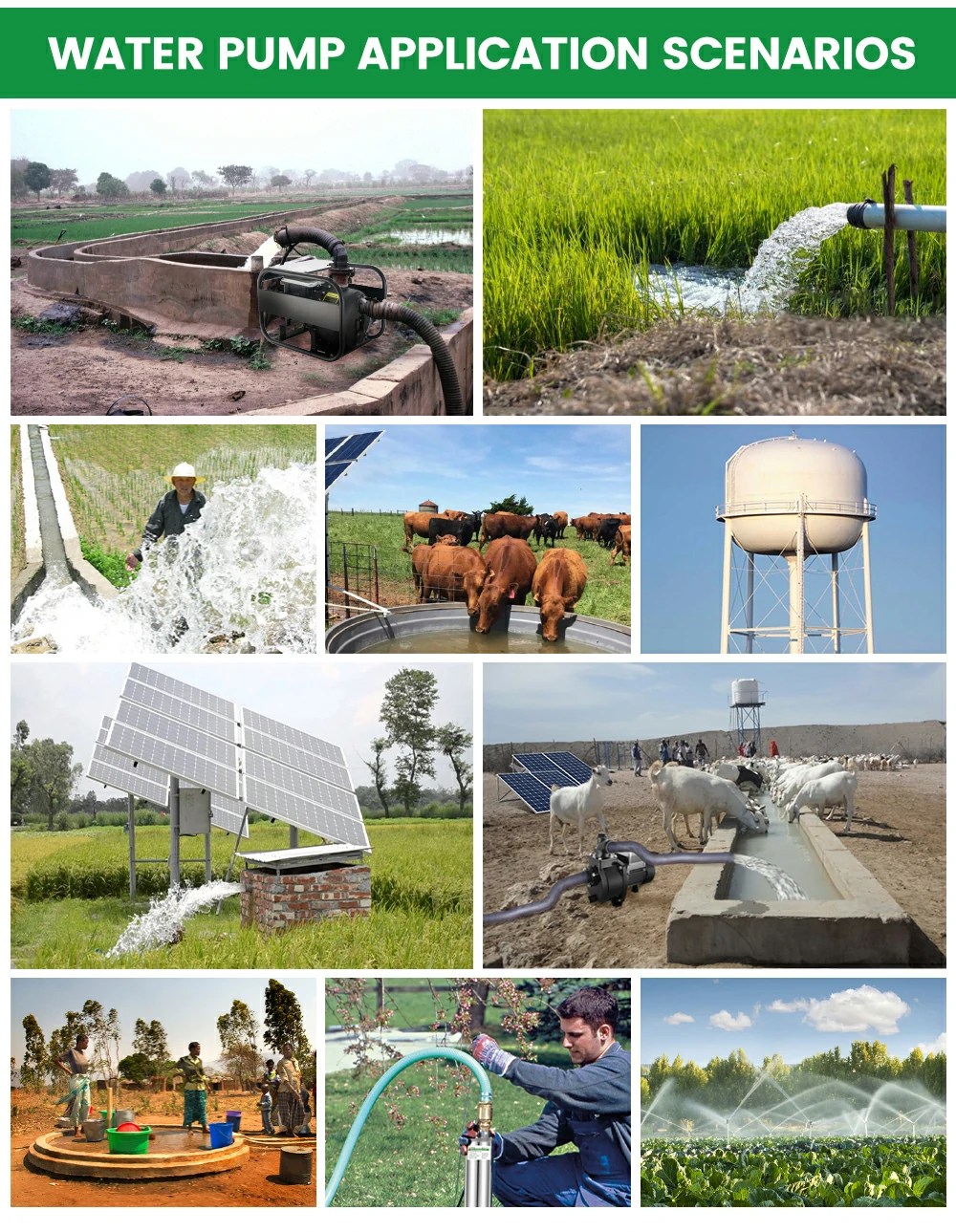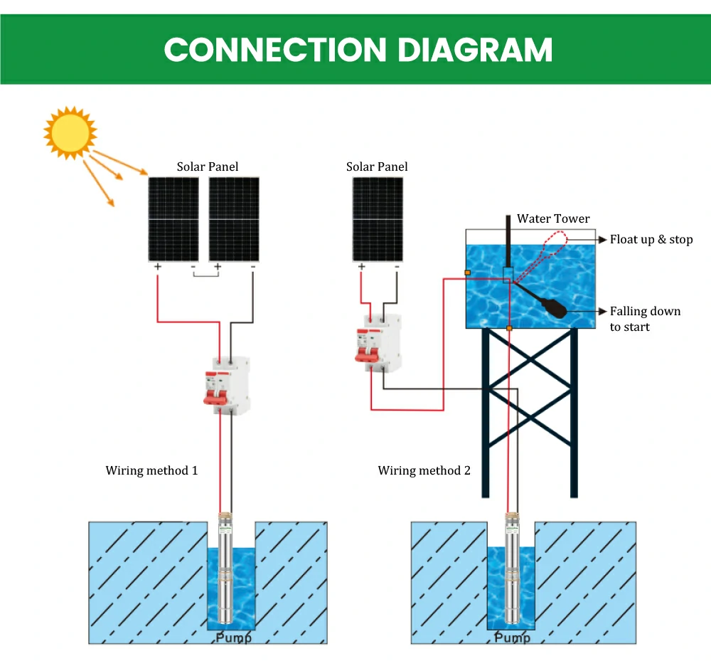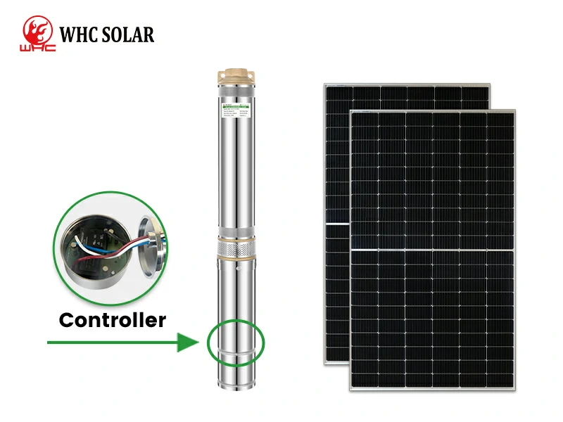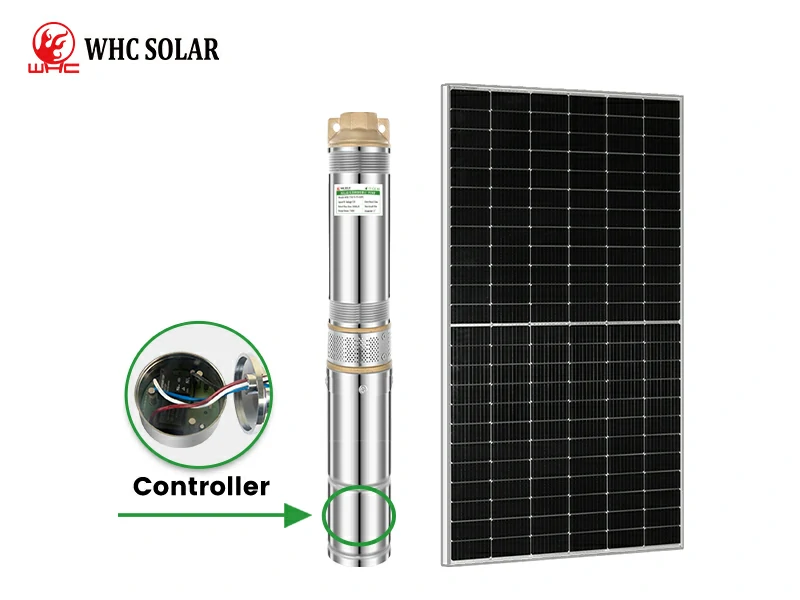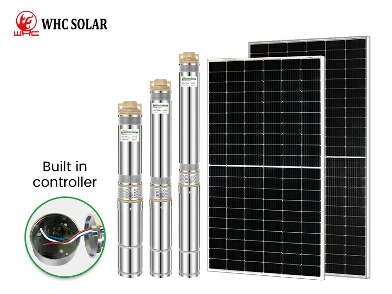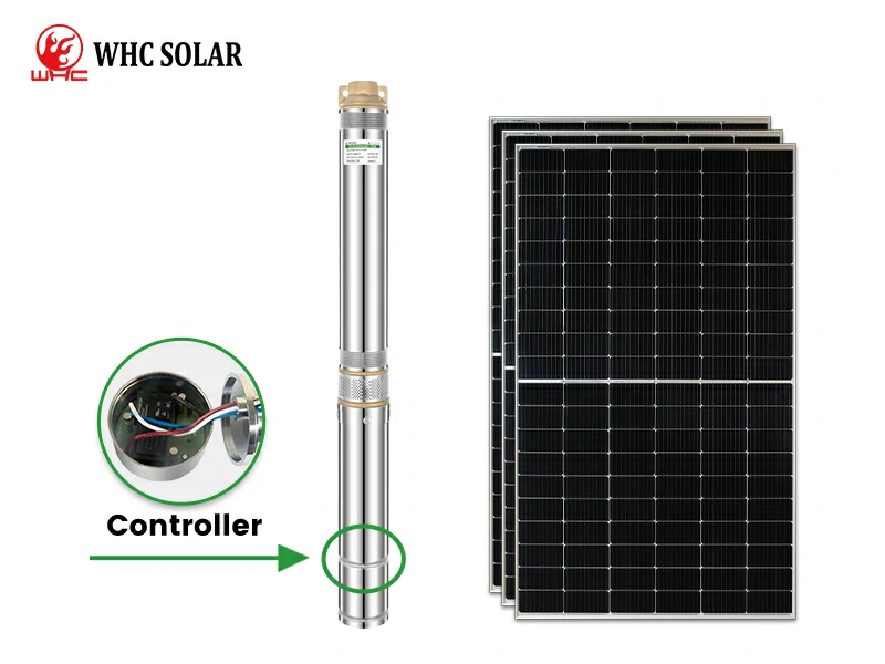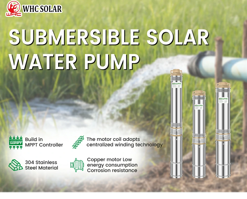 WHC Submersible Solar Water Pump is a type of water pump powered by solar panels’ electricity. The pump is usually placed underwater and can be used to pump water from a well or borehole. Solar panels are mounted on the ground and power submersible pumps, by collecting sunlight and converting it into electricity. The water is then pumped to the surface and used for irrigation, drinking, or domestic use.