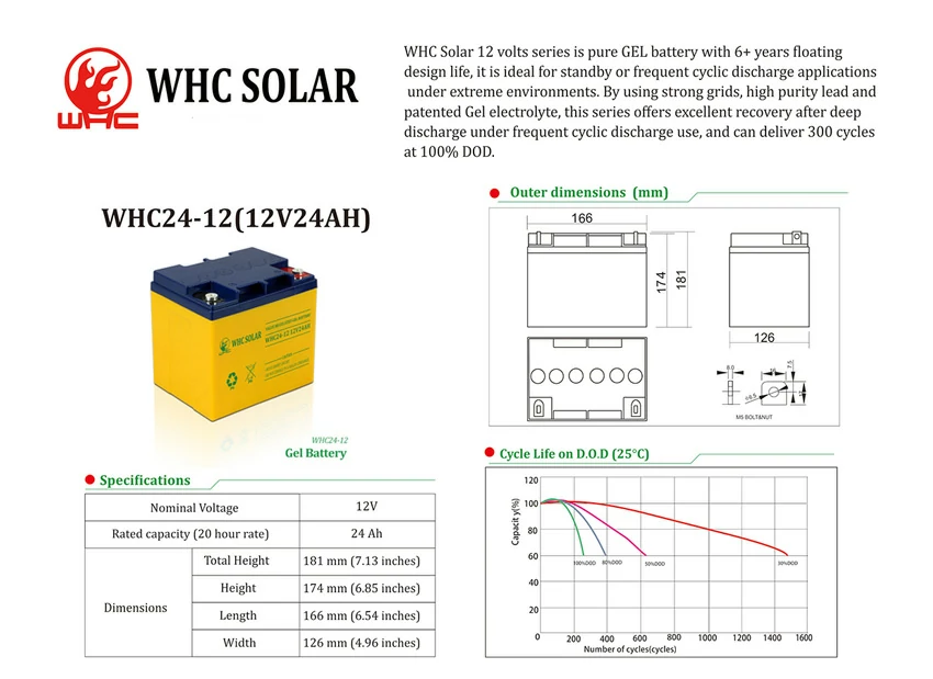In daily life, solar energy storage is a necessity for every family, so you will definitely need a solar battery energy storage system to work effectively to run loaded equipment. Because it is used in electrical equipment in the home, such as small electrical appliances, power tools, uninterruptible power supplies and other equipment that require solar battery energy storage systems to work. Our WHC 24-12 12V 24AH solar battery energy storage system can achieve and apply the above functions, providing stable and safe energy for every need for work equipment.